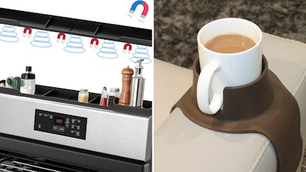 No tools are necessary when installing this shelf. A series of magnets on the bottom allow you to place it right on top of your stove without having to worry about it shaking loose — and two dividers in the center help you keep everything from spice bottles to oil dispensers organized. Choose from two finishes: black or white.